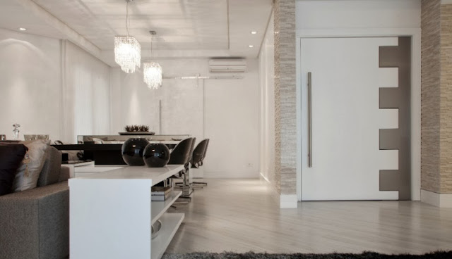 26- Porta de madeira branca com detalhe em inox, super imponente!!