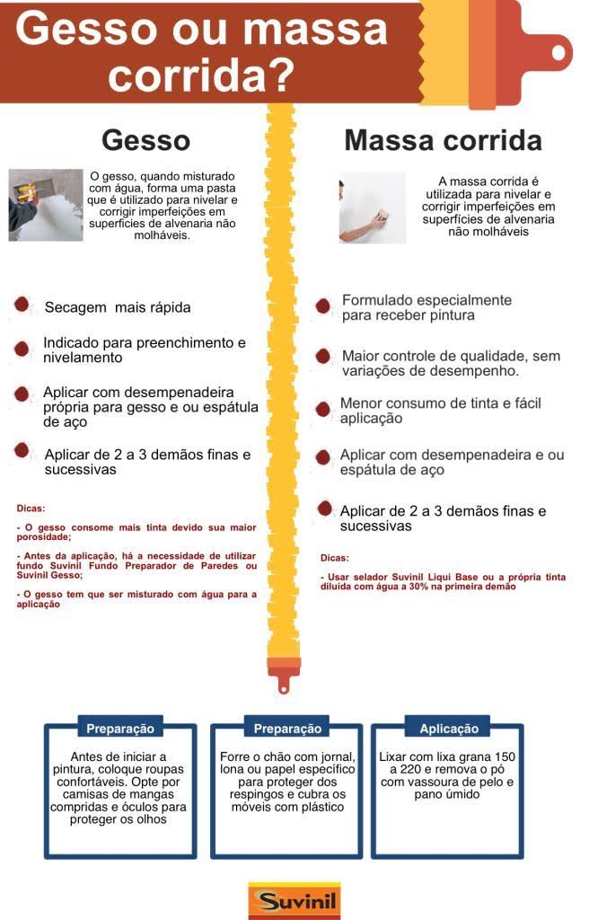No momento de renovar um cômodo, é comum surgirem algumas dúvidas, principalmente na escolha do acabamento. Então, veja algumas dicas para saber qual é a melhor opção para sua necessidade: gesso ou massa corrida? Confira abaixo: