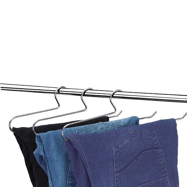 5. Usar cabides próprios para pendurar calças jeans, de preferência em madeira ou inox, para que não ficam abaulados com o peso da calça. As saias podem ser colocadas em cabides com prendedores. Para cintos, gravatas e lenços existem cabides especiais.