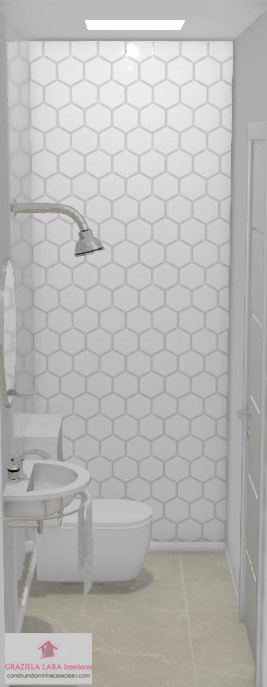 Chuveiro: como não tem espaço para box, mas para um banho rápido, pode ser colocado o chuveiro/ducha entre a pia e o vaso, ou então, colocar apenas uma divisória de vidro jateado branco ao lado da pia.